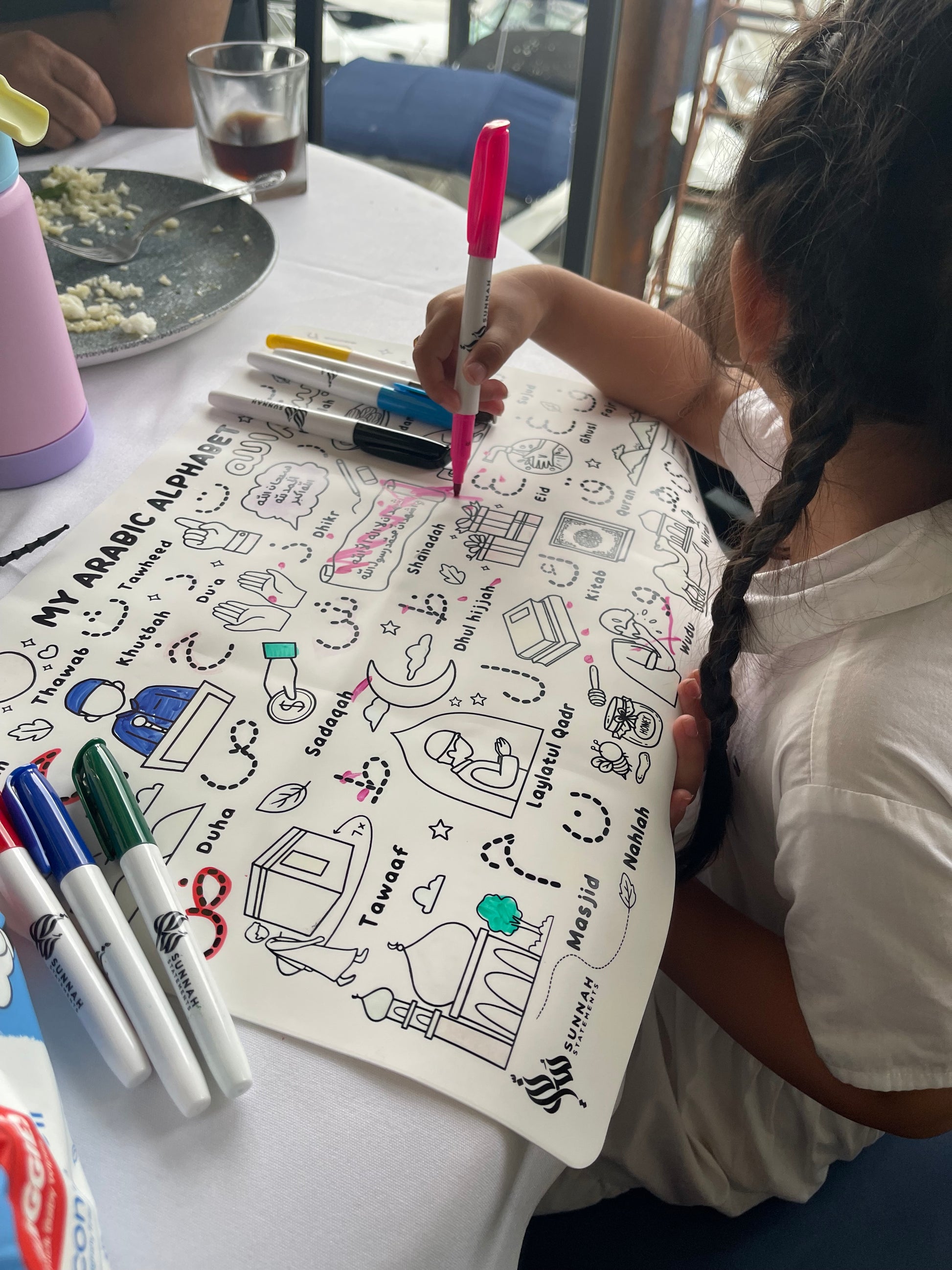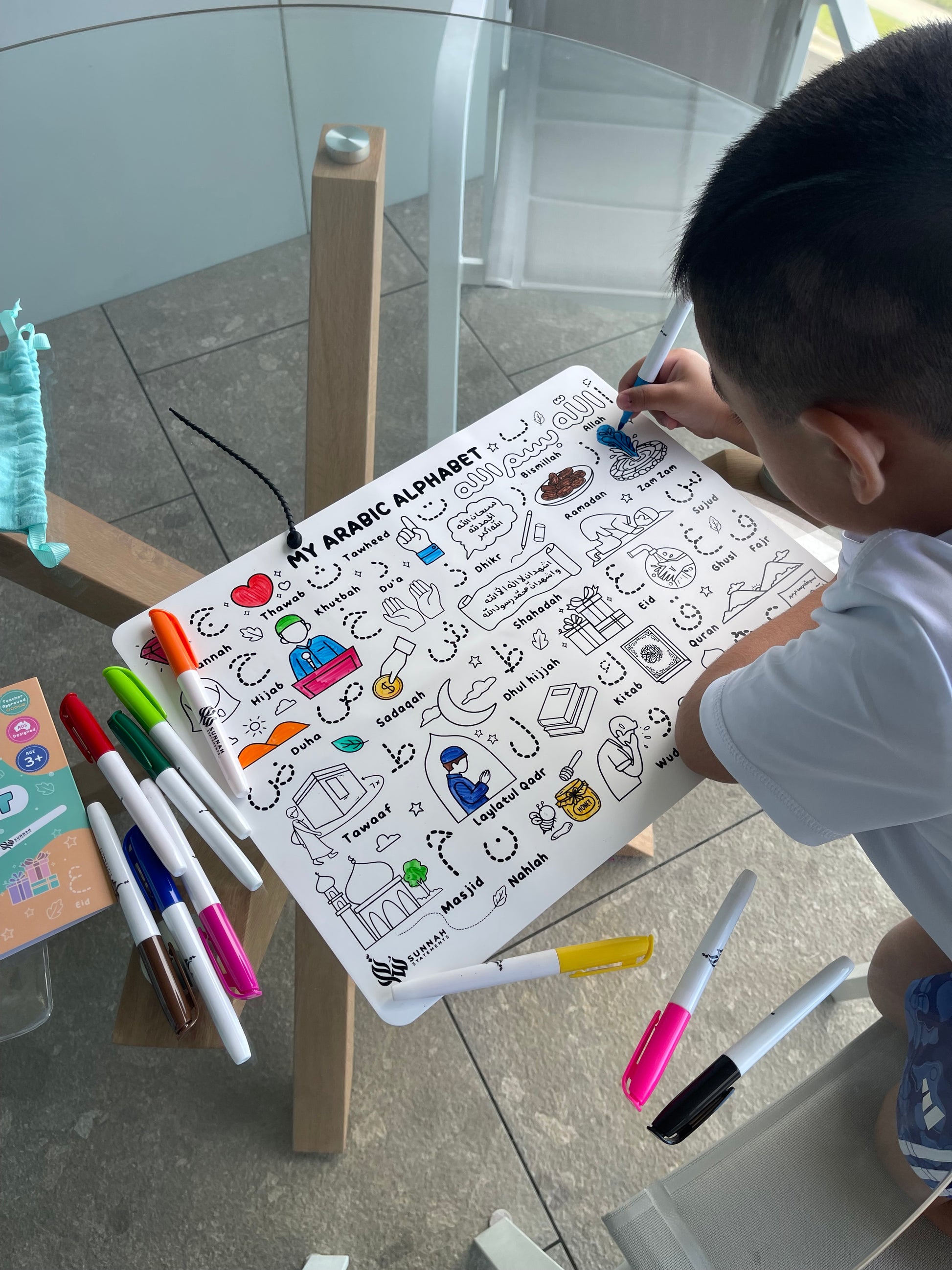 I bought this for my daughter who is raised multilingual and this mat is meant to aid her Arabic side. She loved the different images and loves taking it to the mosque on Fridays and show it to everyone who is willing to look. From a mother's perspective, the mat is great quality, washes off easily and the pens come in many colours. Highly recommended product!