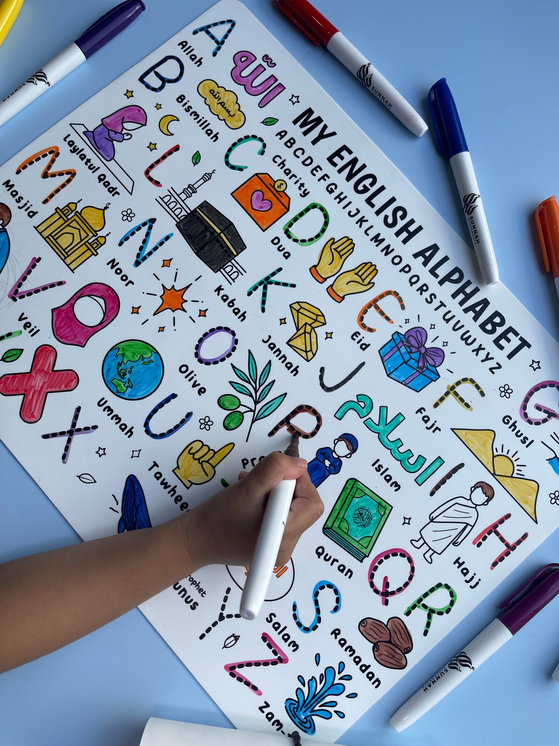 We love that it comes with a beautiful carry bag so we can take it with us anywhere. The design allows us to keep teaching her the English alphabet while also encouraging conversations about Islam and allowing us to talk about it while she colours.